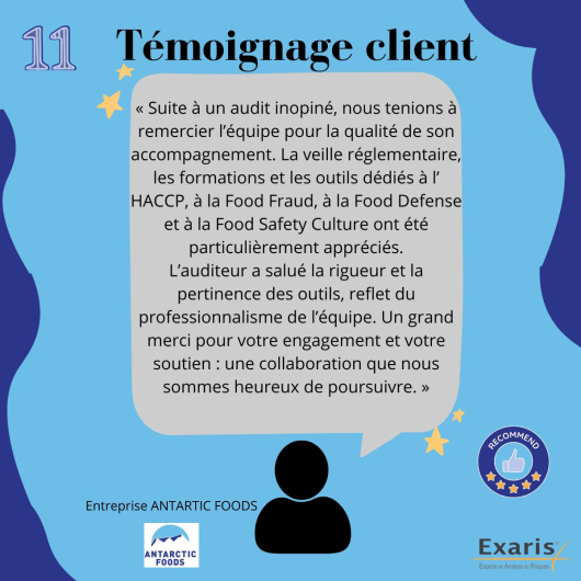 Ce témoignage de l'équipe Qualité Antarctic Foods fait suite à un audit inopiné où la rigueur du suivi, la pertinence des outils et l’accompagnement personnalisé ont été particulièrement appréciés.