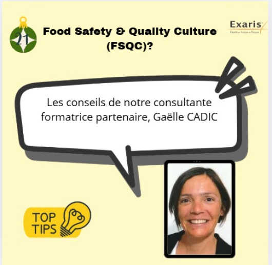 Gaëlle CADIC, consultante et formatrice partenaire d’Exaris depuis de nombreuses années, partage ses tips concrets pour mettre en place et animer la Food Safety Culture au sein de votre entreprise.
