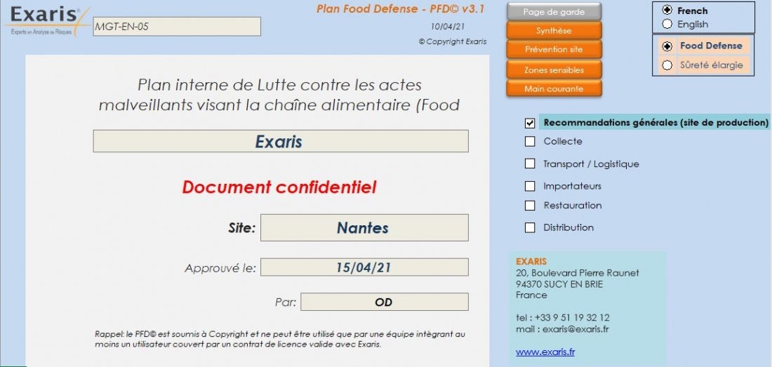 - L’intégration d’une colonne Zone sensible sûreté qui permet donc maintenant de gérer des zones sensibles au sens de la sécurité du produit (« sensibles Food ») et des zones sensibles au regard de critères de sûreté élargie (« sensibles sûreté »), non spécifiques aux risques de contamination des produits ; les stratégies de réduction des risques (accessibilité, détection) étant les mêmes.