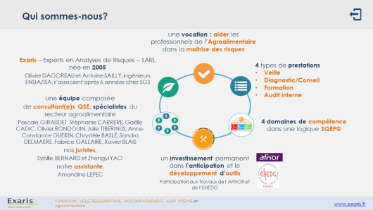 « La société Exaris (Experts en Analyse de Risques) a été créée le 2 mai 2005. Son objectif : aider les acteurs de la chaîne alimentaire à optimiser leurs Systèmes de Management de la Qualité en s’appuyant sur l’analyse de risques, véritable outil de management.
