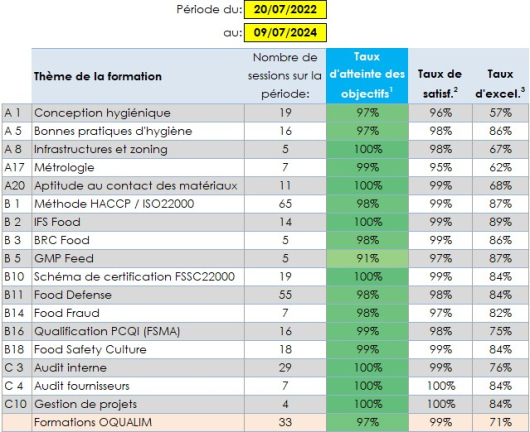 Le tableau ci-dessous synthétise le taux de satisfaction des participants à nos formations, depuis la date indiquée, pour les thèmes ayant fait l'objet d'au moins 4 sessions.